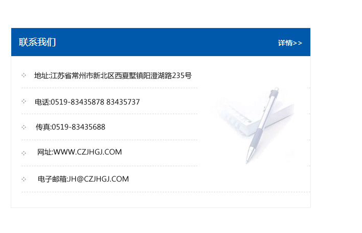 地址:常州市新北區友邦商務大廈1幢16、17層  電話:0519-85101652  傳真:0519-85112595  郵編:213022  網址:www_cz-jiayue_cn.shirleycn.com  郵箱:xiajifengaa@163.com